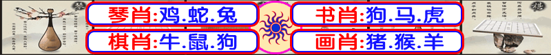 067期:琴棋书画【琴棋书】开:虎05对 068期:琴棋书画【画琴棋】开:猴23对 069期:琴棋书画【棋书画】开:羊24对 070期:琴棋书画【书画琴】开:马25对 071期:琴棋书画【画琴棋】开:羊48对 072期:琴棋书画【画棋书】开:發00对 (琴)鸡蛇兔(棋)牛鼠狗